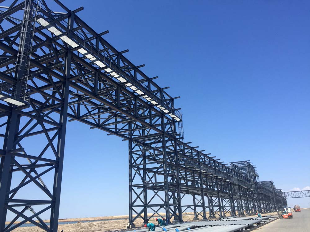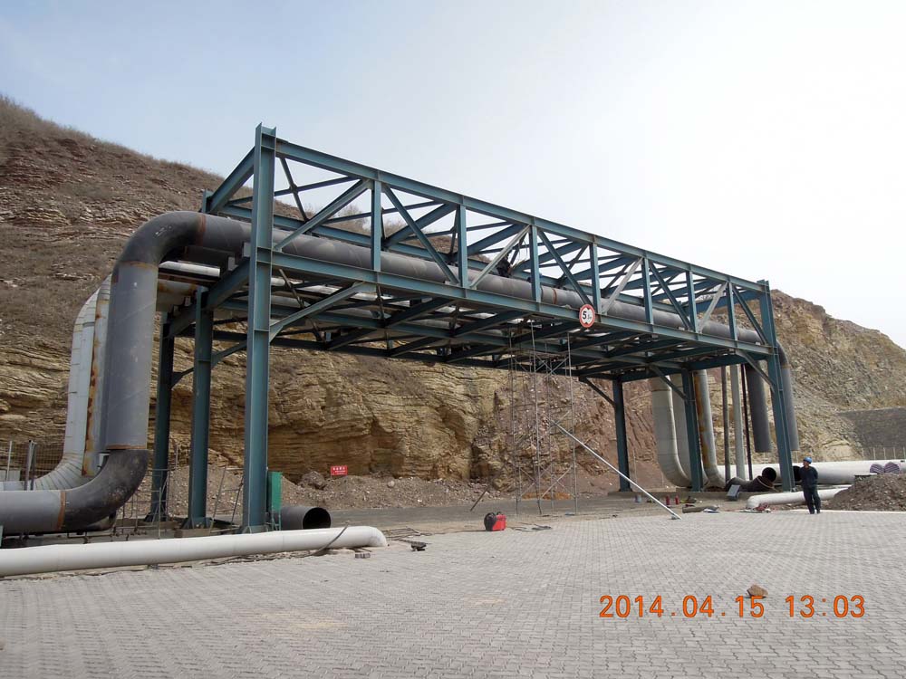 The public pipe gallery is about 35km in length, and the width of main pipe gallery is 9m with the column spacing of 6m and overhang height of 1.5m on both sides. The total width of branch pipe gallery is 6m, with the column spacing of 3m and overhang height of 1.5m on both sides. The superstructure has a steel-truss structure and the steel-truss connections in longitudinal direction; and the substructure is a prefabricated pile cap made of the prestressed high-strength concrete.