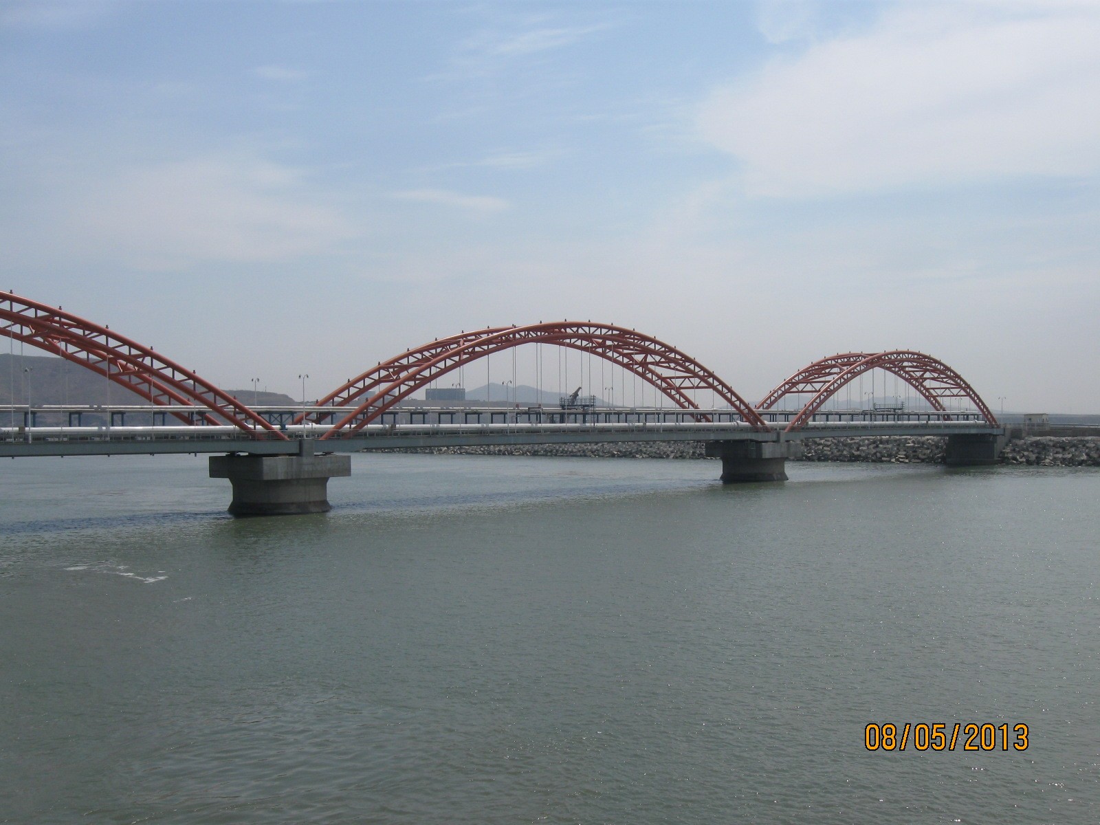 The trestle bridge covers a total length of 310.3m and a total width of 13.6m, which connects the working platform and approach bridge at the breakwater. As a three-span tied bridge with concrete filled steel tube arch, the rise-span ratio of this trestle bridge is 1/5.7 based on the single span-length and calculated span of 102m and 97m respectively.