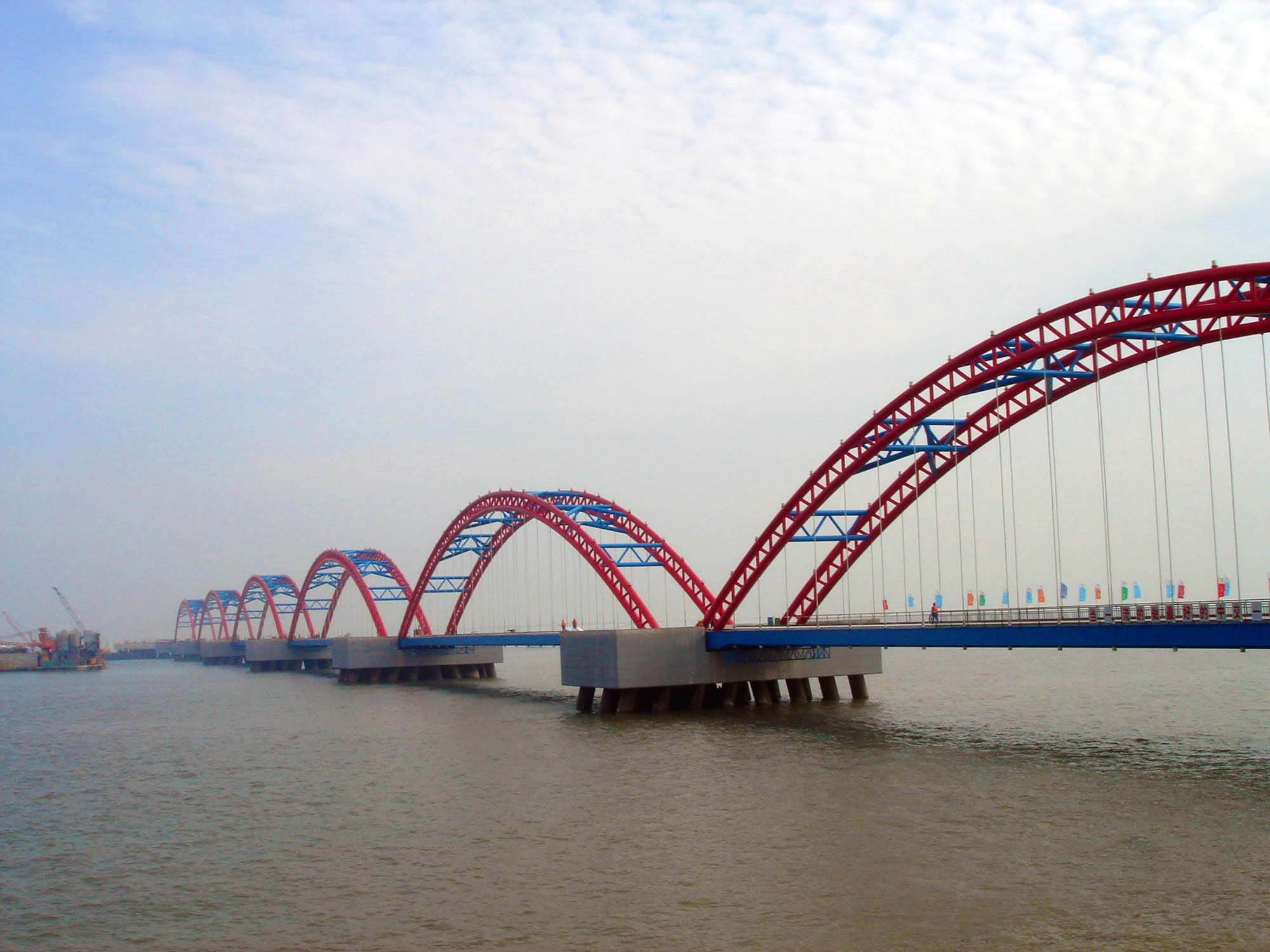 Located on the north side of Laoshan Port, the project site is adjacent to the existing Tonghai Terminal. The respective construction of two new 0.3Mt crude oil terminals will be completed in Phase I & II. The superstructure design of approach bridge undertaken by the Institute has been completed in September 2006. Based on the classification criteria, the approach with 6 spans (single span-length 125m) is classified as a large bridge (length 788.3m), the safety level of structural design is Level-II and the estimated construction cost is about RMB 82 million.