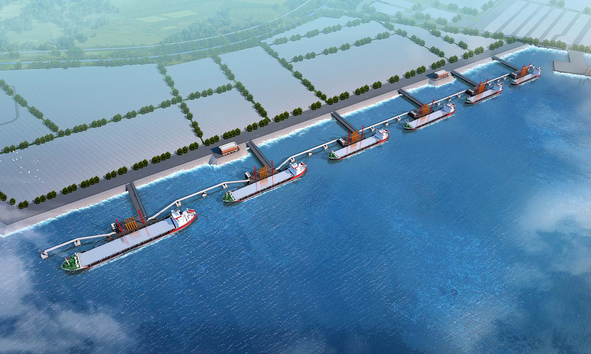 6 new liquid bulk berths: one 5,000-DWT refined oil and LPG berth, one 10,000-DWT refined oil and liquid chemical berth, one 20,000-DWT refined oil and LPG berth, one 20,000-DWT refined oil and liquid chemical berth, one 30,000-DWT refined oil and liquid chemical berth and one 50,000-DWT refined oil berth, with a handling capacity of 11,510,000 t/a, a shoreline length of 1,261 m and a bank revetment length of 1,641 m.